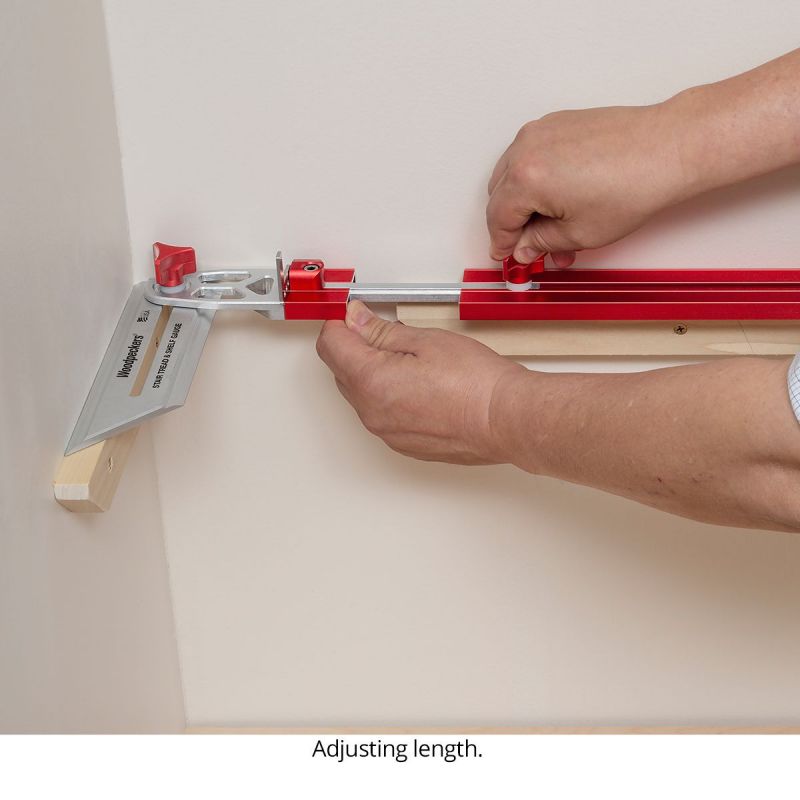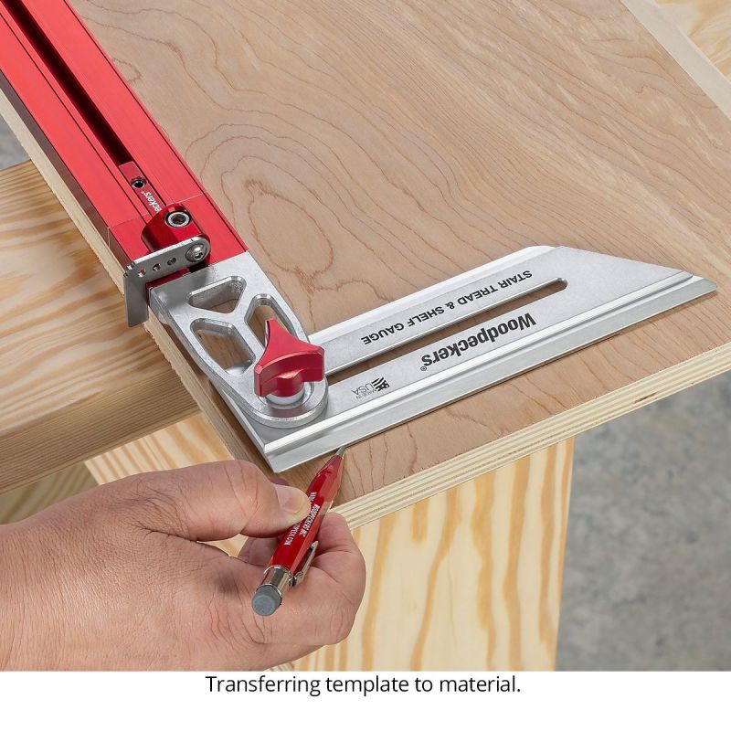 - Woodpeckers Stair Tread & Shelf Gauge instantly creates a template for any captured panel, compensating for angle error on the ends and giving you perfect length without measuring.