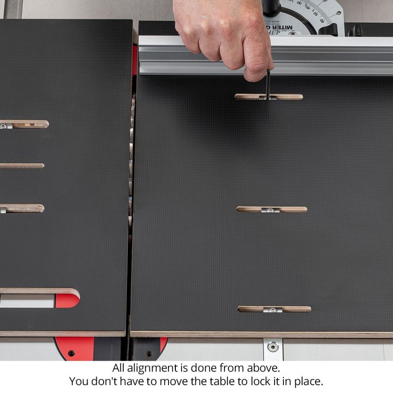 - Let’s take a closer look at the features, starting with the sled adjustment. The sled attaches to the miter bar with 3 socket-head cap screws riding in milled slots. The slots give the sled the range needed to fit almost any table saw. Best of all, the adjustments are all made from above. You can tweak the sled into perfect alignment with your saw blade and lock it securely without ever removing it from the table saw. We machine the sled from 1/2" Baltic Birch plywood that has a black micro-dot laminate on both sides. It's flat, stable and low-friction.