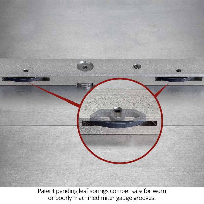 - The miter bar has 4 leaf springs along the edge. The springs automatically adjust for miter slots that have worn over time or were poorly sized to begin with. They'll even average out slots that vary in dimension and help you get good results from a "less than perfect" saw. If your saw has a T-shaped miter slot, a pair of oblong spacers fit the T-slot and keep your bar in place when fully extended. Don't worry if you don't have a T-slot…the spacers come off in seconds to fit normal 3/8" x 3/4" slots.