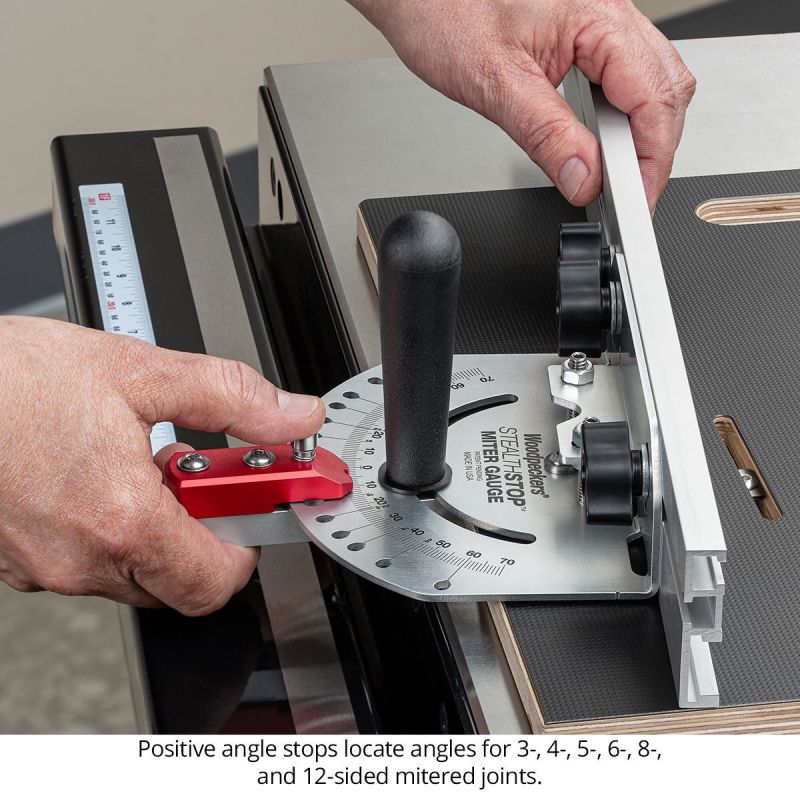 - The protractor and its positive stops represent the spirit of Woodpeckers engineering. A typical "pin in a hole" index requires clearance tolerances to avoid binding. Even held to very strict tolerance there's "wiggle room". To eliminate that, the StealthStop miter gauge head uses a tapered index pin. The tapered pin engaging the hole ensures perfect centering without risk of binding…and no wiggle room, even after thousands of cycles. Calibration of the protractor is dead simple and once calibrated for square cuts, all the angle stops are spot-on, too.
