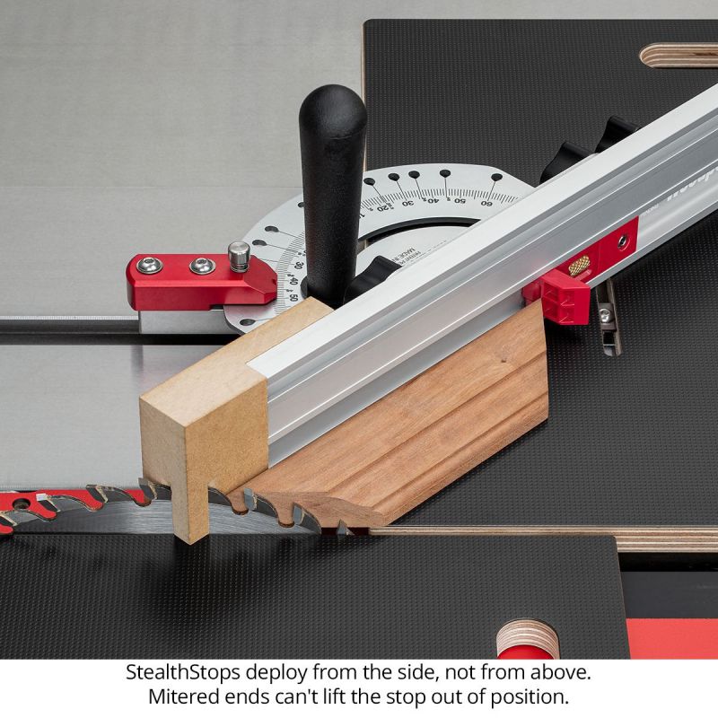 - When you talk about the flip stops, the name says it all. StealthStops retract completely within the fence when they're not needed, then flip out instantly when they are. They're always ready, but never in the way. The micro-adjuster has a generous range of motion with minimal backlash. By flipping out sideways (instead of down from above) you never worry about mitered ends lifting a stop out of position.