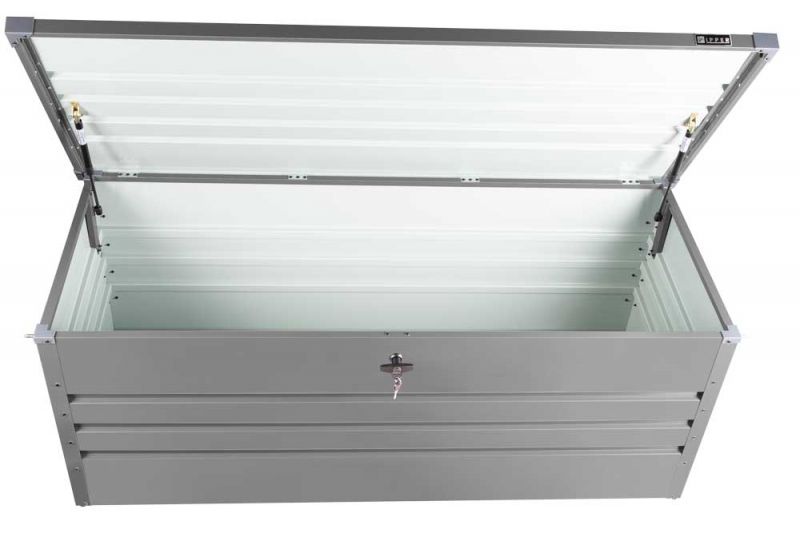 Zipper lockable steel garden box ideal for storing various garden and pool accessories such as cushions, seat cushions, blankets, as well as garden tools and animal food.