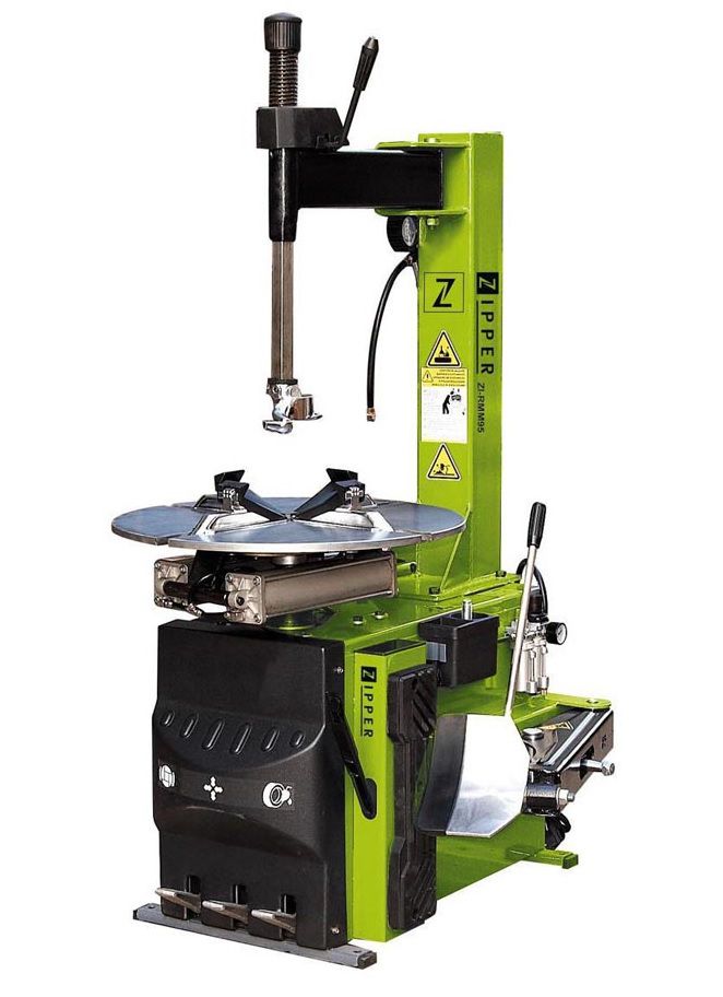 Easy handling and user friendly Zipper RMM95 tyre mounting machine capable of removing and replacing tyres on car and van wheels. Powered by a fully motorised turntable and fitted with pneumatically operated, self-centered 4 x jaw clamping system. Jaws made out of special steel with clamping area for cars and vans. Strong lateral bead breaker enabling the changing of conventional tyres quickly and easily. Plastic glides ensure protection and preservation of tyres and rims. The bead breaker is attached with a large anti-skid rubber pad, which preserves the tyres and rims.